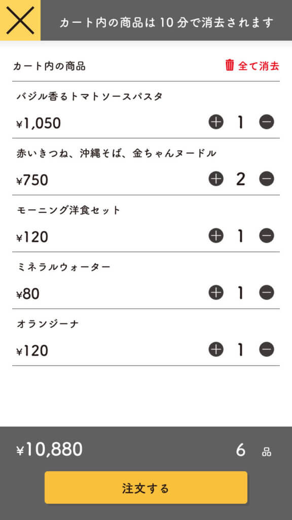 利用客側で注文したいものを選択すると、カート内に商品が入ります。