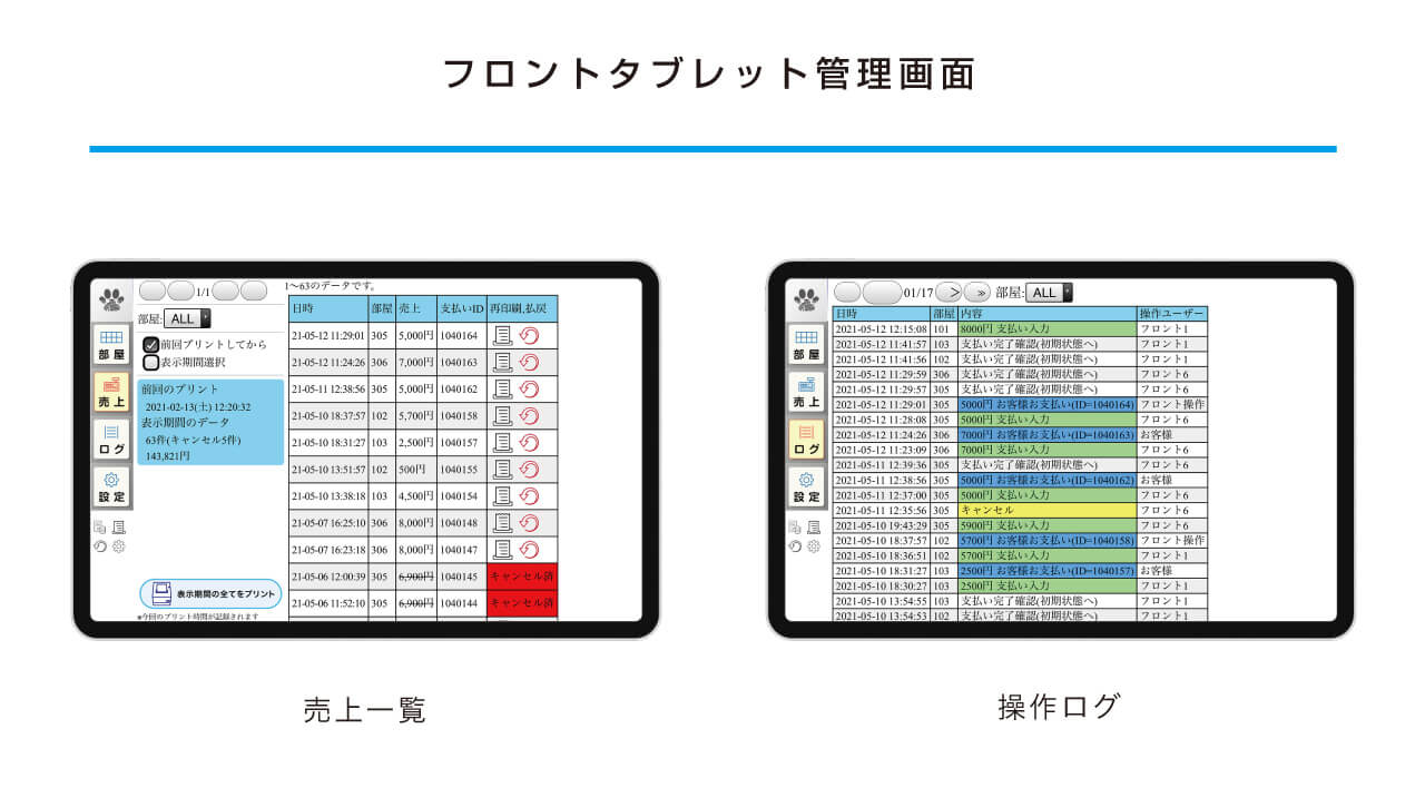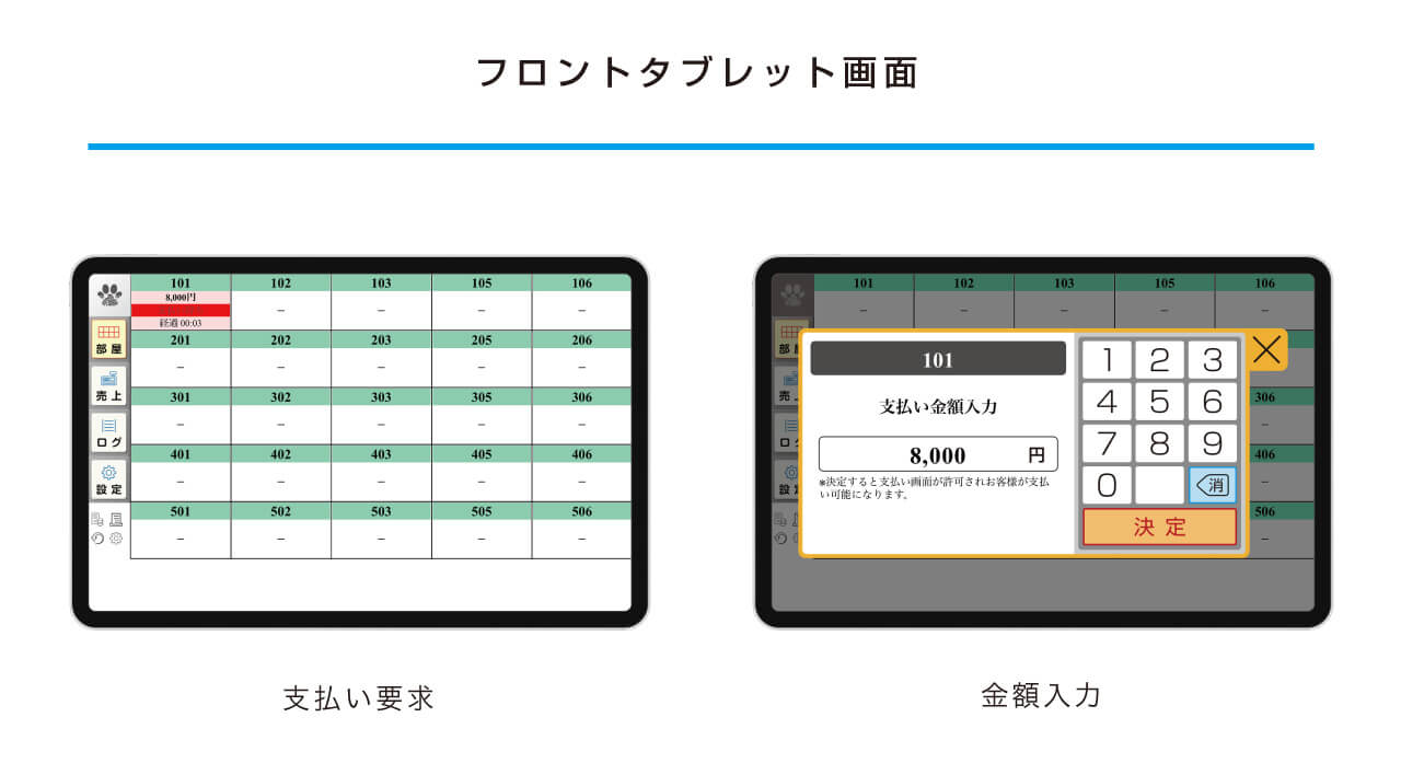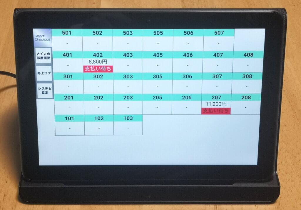 ホテル側の画面は、上記の通りです。ひとめで支払い状況が分かるので、同時に複数の部屋で退室になった場合でも安心でしょう。