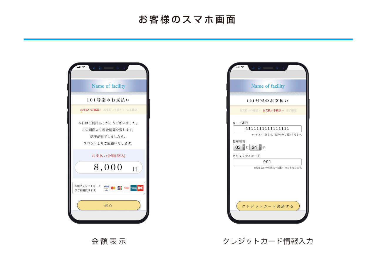 利用客側には、フロントで入力した金額が表示されます。後は画面の案内に沿ってクレジットカード情報を入れ、決済させると支払い完了です。